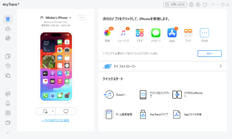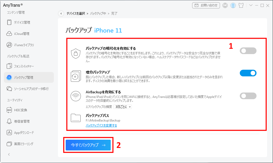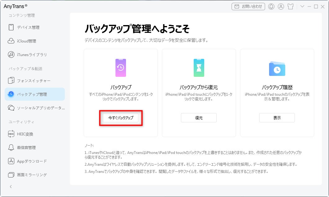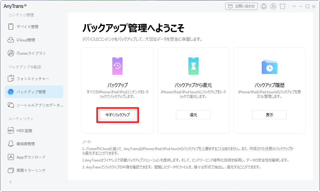 もし以上の方法を試してもiPhoneのバックアップが終わらない場合、iOSデバイス向けの専門的なデータ転送ソフト、AnyTransを使ってバックアップするのをおすすめします。AnyTransはデータを自由にiOSデバイスiTunes、iCloud、およびパソコン間で転送できます。対応できるデータの種類も全面です。また、いくつかのモードがありますので場合によって選べます。