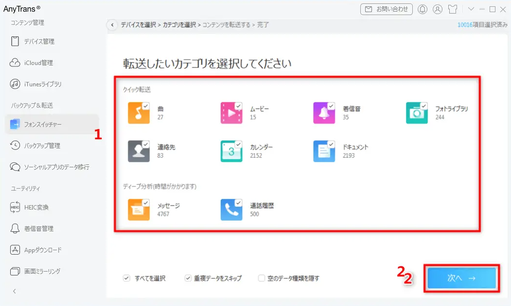 Step4.転送できるデータのリストがす表示されます。移行したいデータのカテゴリにチェックを入れて、「次へ」をクリックします。転送が始まります。