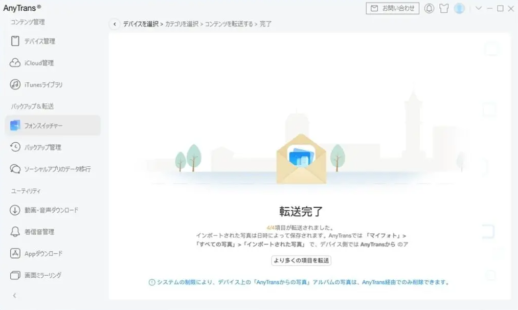 以上はiPhoneのバックアップが終わらないや残り時間が減らない場合の原因と解決策です。いかがでしょうか。公式的なバックアップサービスは安全性が高いので広く使っていますが、容量とインターネットの問題で転送が途切れる状況がよく発生します。それに対して、Anytransはもっと安定で、データのバックアップと移行にも対応できます。なのでデータ管理の必要があるとき、Anytransを強くおすすめします。
