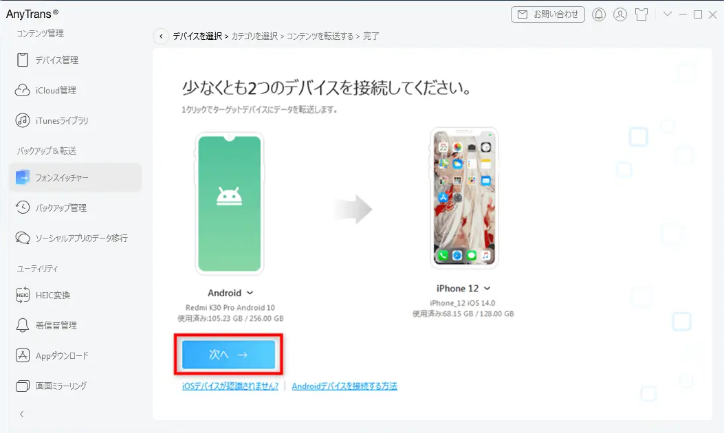 Step3.二つのデバイスも認識されたら、「次へ」をクリックします。