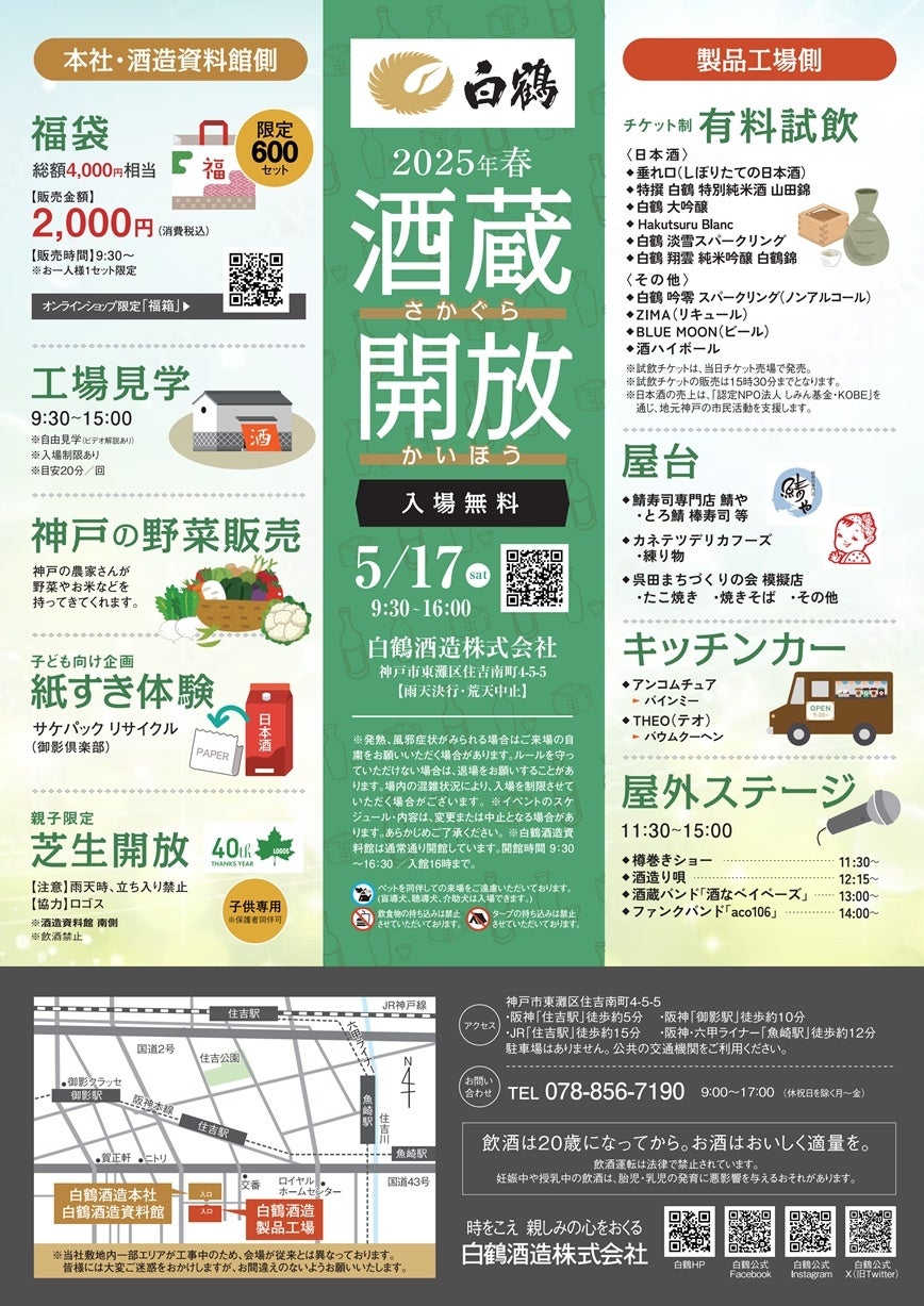 白鶴酒造株式会社は、地域貢献と日本酒の需要開発、白鶴ブランドのPRを目的として2025年5月17日(土)に「白鶴2025年春『酒蔵開放』」を開催します。