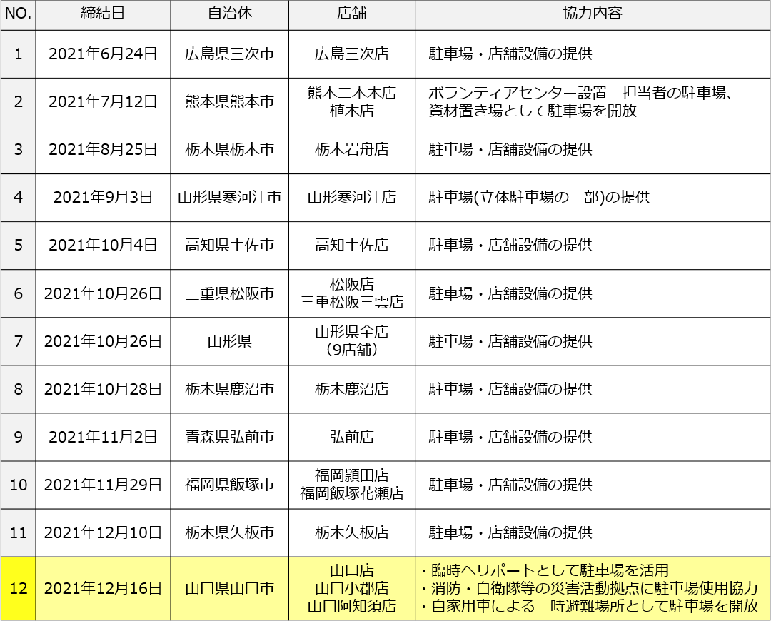 具体的な協定内容は、山口市内で大規模災害が発生、または発生する恐れがある場合に、ダイナム山口店、ダイナム山口小郡店、ダイナム山口阿知須店の駐車場の一部を消防・自衛隊等の災害活動拠点として提供するものです。この度の防災協定の締結は、当社と地方自治体が協力し、災害発生時に迅速かつ円滑に被災地を支援することを目的としており、当社と地方自治体との防災協定締結は今回の山口市との締結で12件目となります。