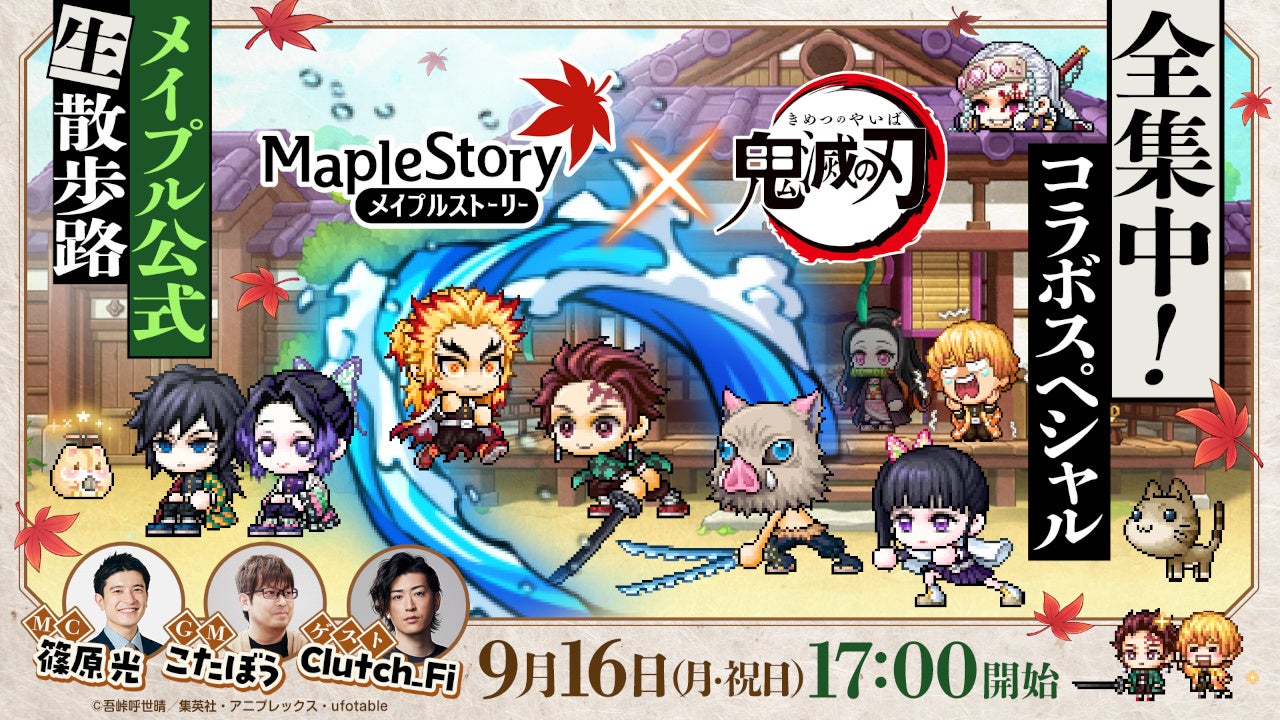 9月19日(木)のコラボ開始に先駆けて配信する今回の生放送は、ゲストに人気ストリーマーのClutch_Fiさんをお招きしてお送りいたします。放送では、メイプル史上最大規模で開催するコラボイベントの詳細をご紹介するほか、コラボ限定職業「炭治郎」による実機プレイの様子も、一足先にご覧いただけます。その他にも、視聴者参加型コーナーやプレゼント企画など、盛りだくさんの内容でお届けする生放送。どうぞお見逃しなく!
