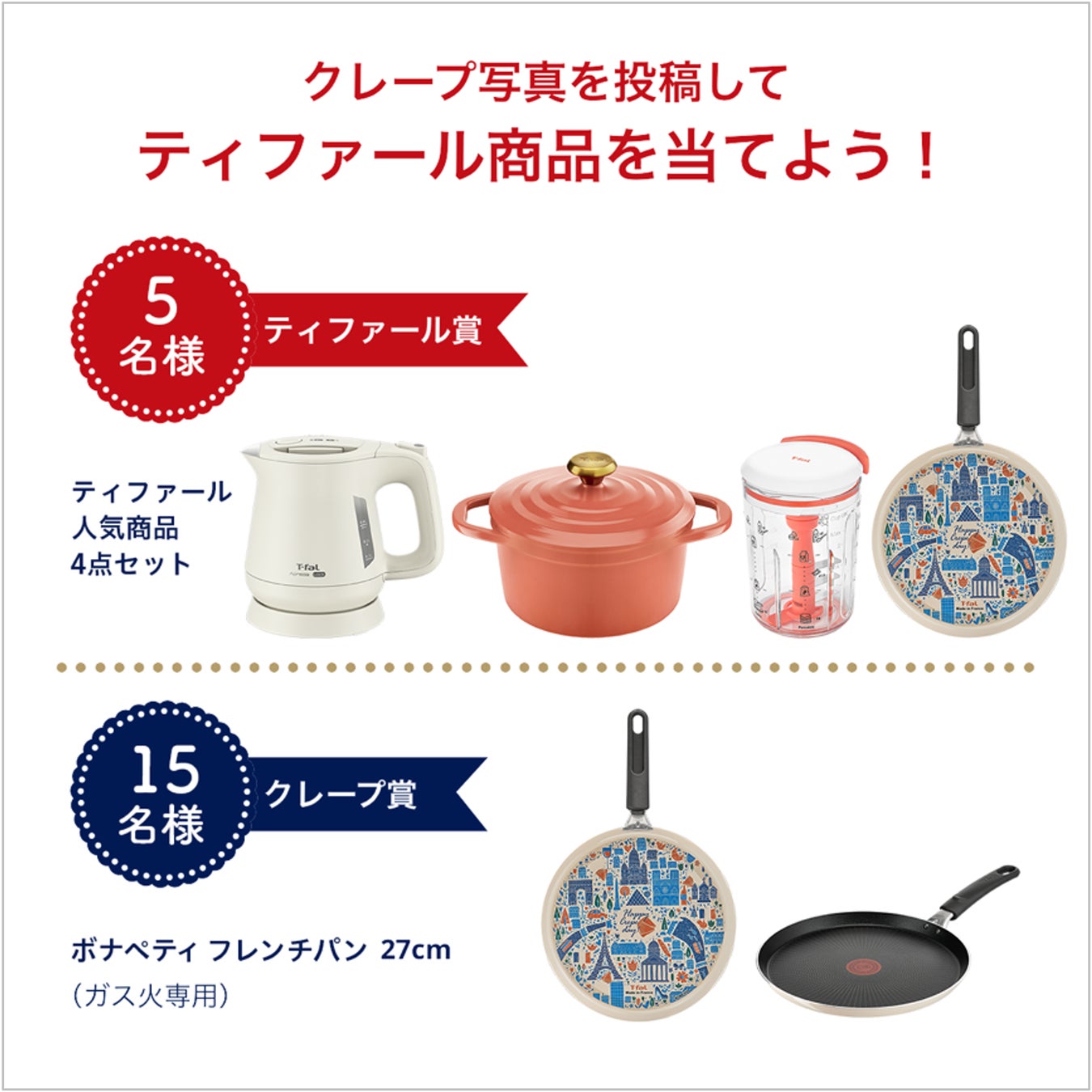 Instagramでは、おうちでクレープ作りを楽しんでいる写真や動画を投稿していただいた方の中から抽選でティファール商品を合計20名様にプレゼントします。Xではクレープ用のフライパン「ボナペティ フレンチパン 27cm」を使って、おうちクレープを楽しみたい方20名様を募集するキャンペーンを実施いたします。