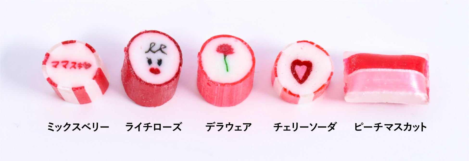 感謝の気持ちを伝えるカーネーションのデザインの他、まるでお子様が描いたようなほっこりするママの似顔絵柄、“ママスキ♡”の文字が入ったキャンディなど、小さなキャンディに感謝の気持ちを詰め込められる商品に仕上げました。フレーバーは、華やかなライチローズやさっぱりジューシーなミックスベリー、ピーチマスカットなどを使用し、忙しい毎日に気分の上がるミックスとなっています。