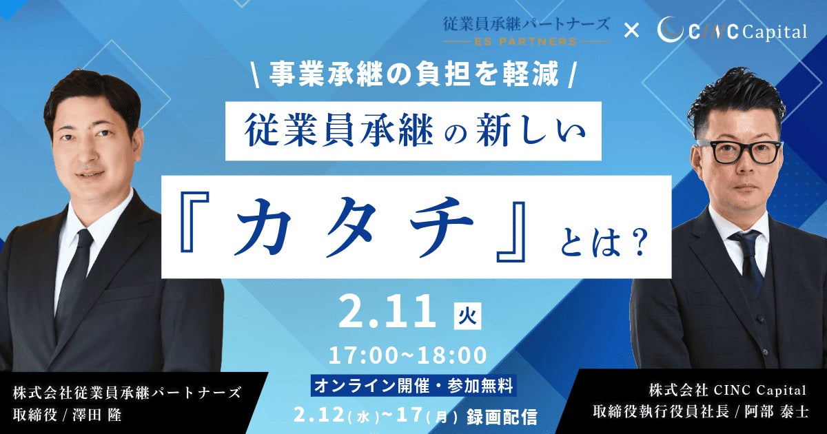 【株式会社CINC】子会社のCINC Capitalによる経営者向けセミナー『事業承継の負担を軽減!従業員承継の新しい「カタチ」とは?~M&Aと徹底比較~』開催のお知らせ