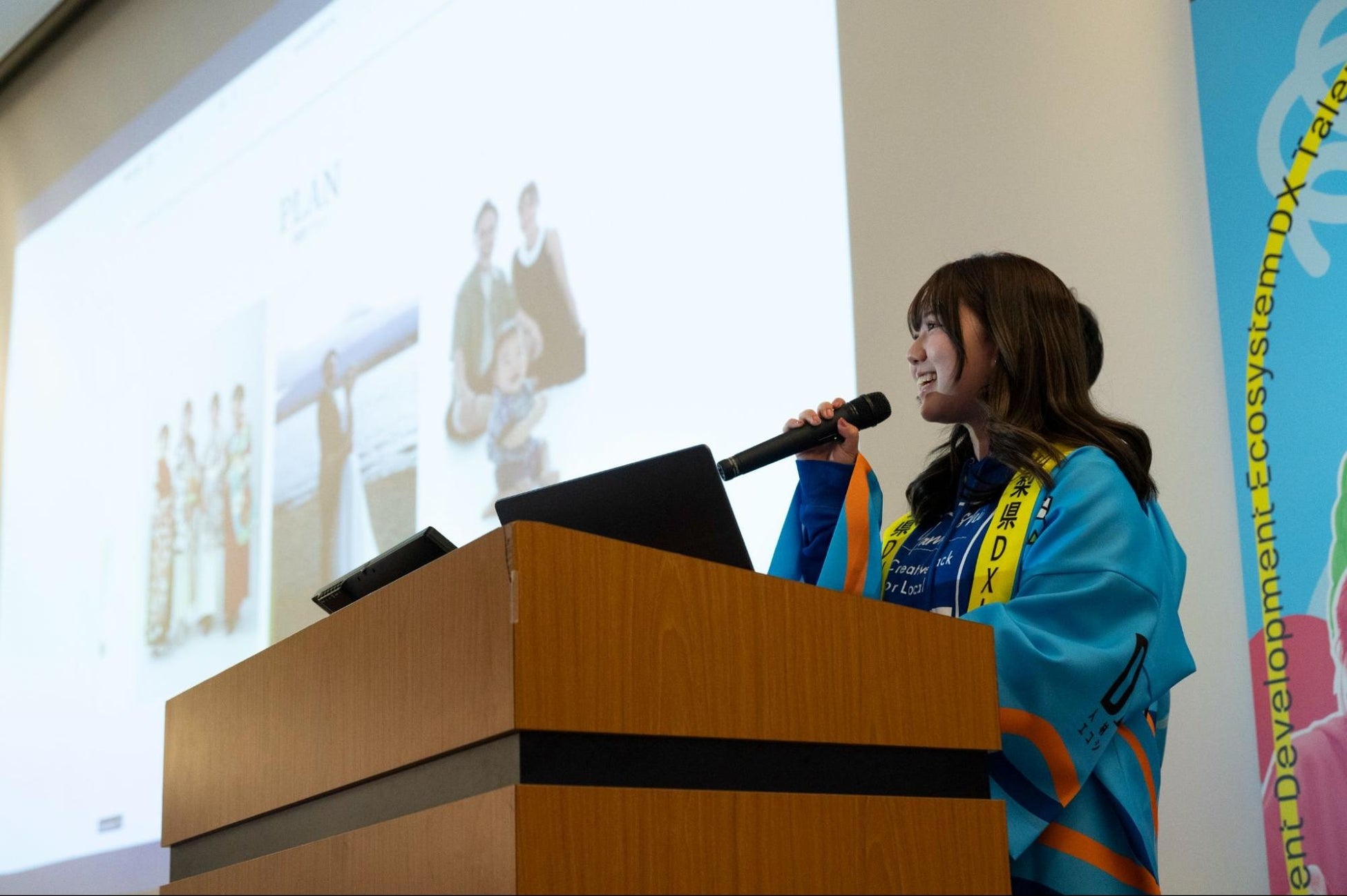 事業2年目に当たる今回の「成果報告会」では、本年度育成した大学生DXリーダーおよび中高生チームの中から代表として、中高生2組、大学生DXリーダー2組が登壇。山梨県が抱える地域課題や、地域企業の経営課題に対して、デジタル技術を活用して取り組んだDX支援の成果についてプレゼンテーションを行いました。当日は山梨県知事の長崎幸太郎氏をはじめ、中小企業経営者、大学関係者、保護者、県外自治体の関係者などが参加し、来場者100名以上を前に、各チームが取り組みの成果を発表しました。