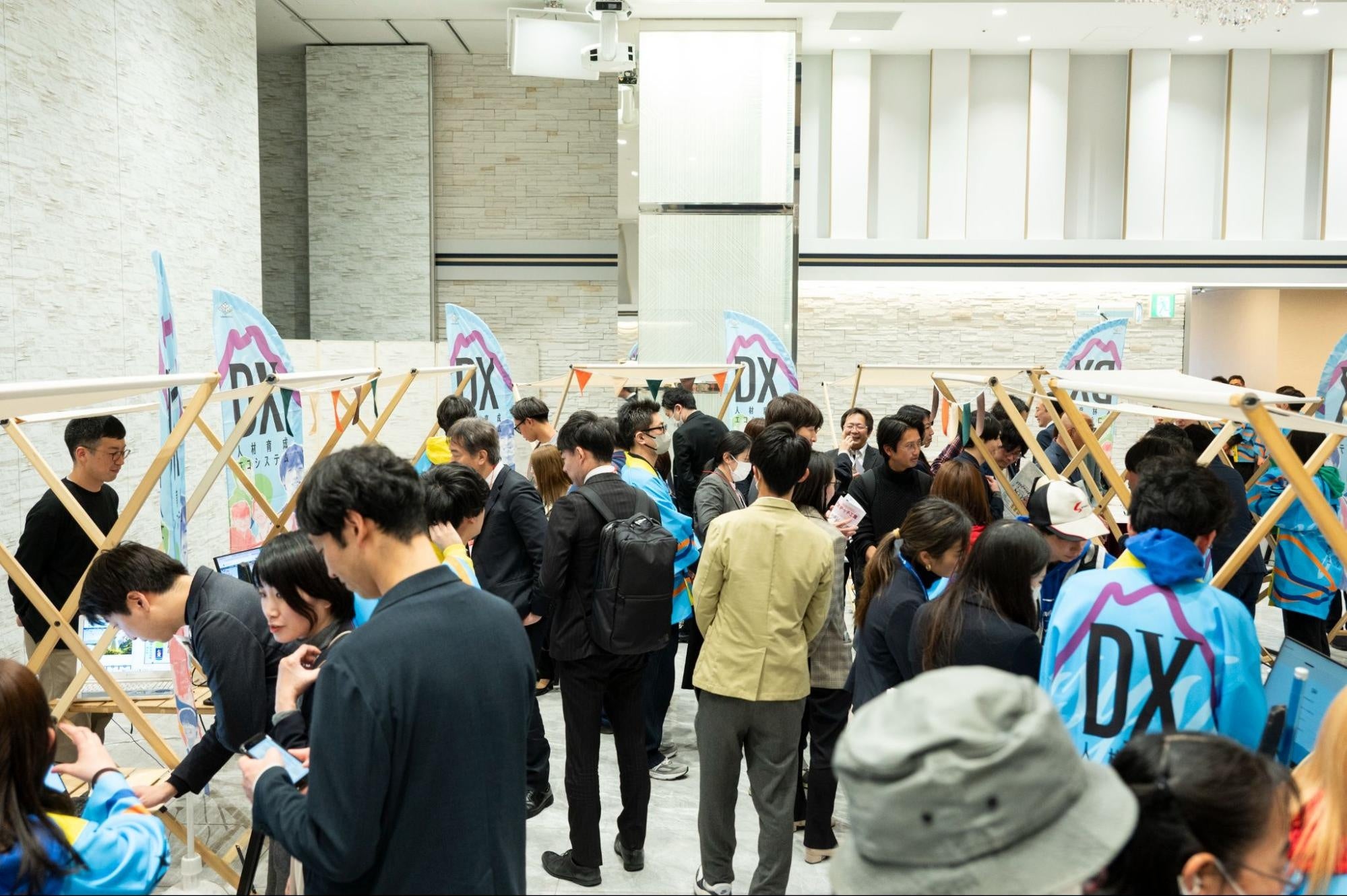 成果報告会に先立って、企業DX支援事例の展示会も開催しました。「デジサポ!やまなし」を活用した中小企業の商品やサービス、支援内容について、大学生DXリーダーが来場者に向けて紹介しました。会場では大学生と県内中小企業関係者や他自治体関係者との交流も生まれ、中小企業のDX推進に向けた相談や意見交換が活発に行われ、展示ブースは多くの来場者で賑わい、会場は終始熱気に包まれました。