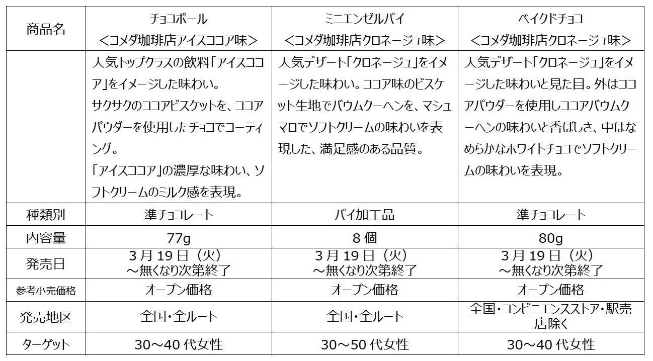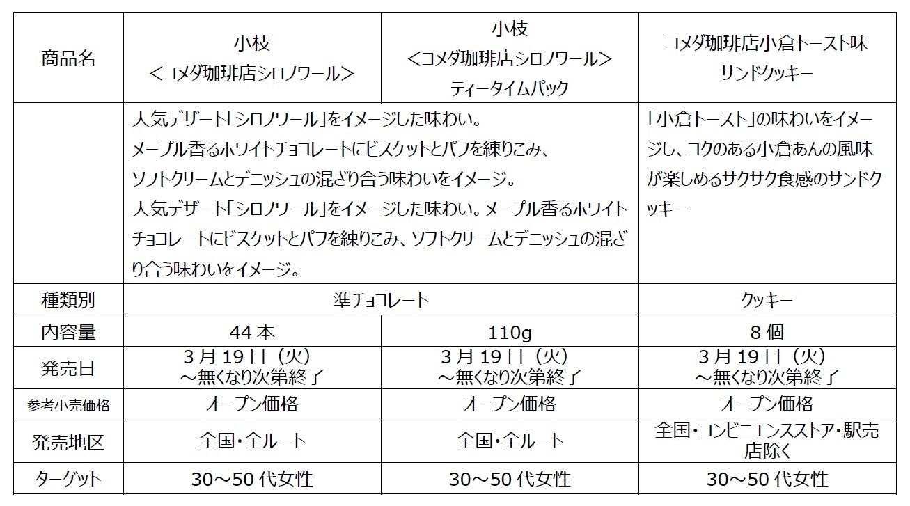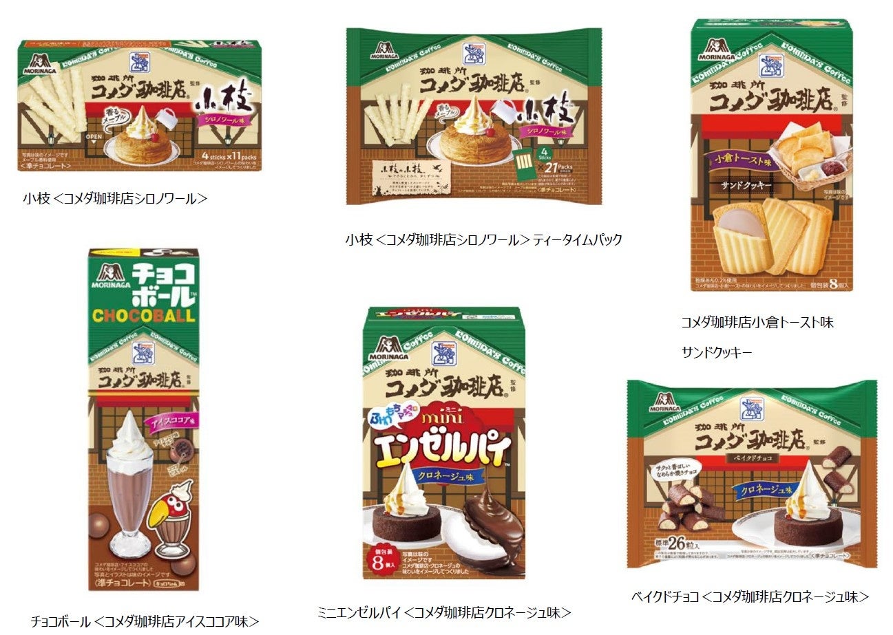 昨年コラボ商品を発売したところ、コメダ珈琲店の人気メニューの香りや味わいの特長を生かしたおいしさが、大好評だったため、今回はバリエーションを増やして展開します。「小枝<コメダ珈琲店シロノワール>」2品、「コメダ珈琲店小倉トースト味サンドクッキー」、「チョコボール<コメダ珈琲店アイスココア味>」、「ミニエンゼルパイ<コメダ珈琲店クロネージュ味>」、「ベイクドチョコ<コメダ珈琲店クロネージュ味>」です。