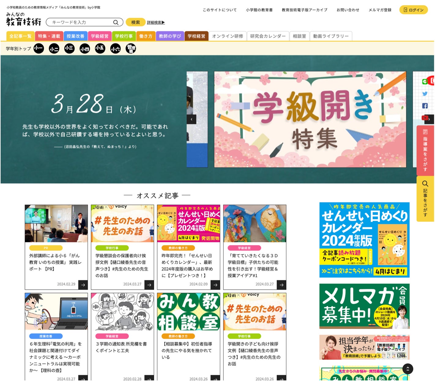 90余年のバックグラウンドを持つ小学館の教師応援誌『教育技術』を前身とした、小学校教員のための教育情報メディア。先生の笑顔が、子どもへ、保護者へと伝播していくように、先生の役に立つ情報を日々発信しています。