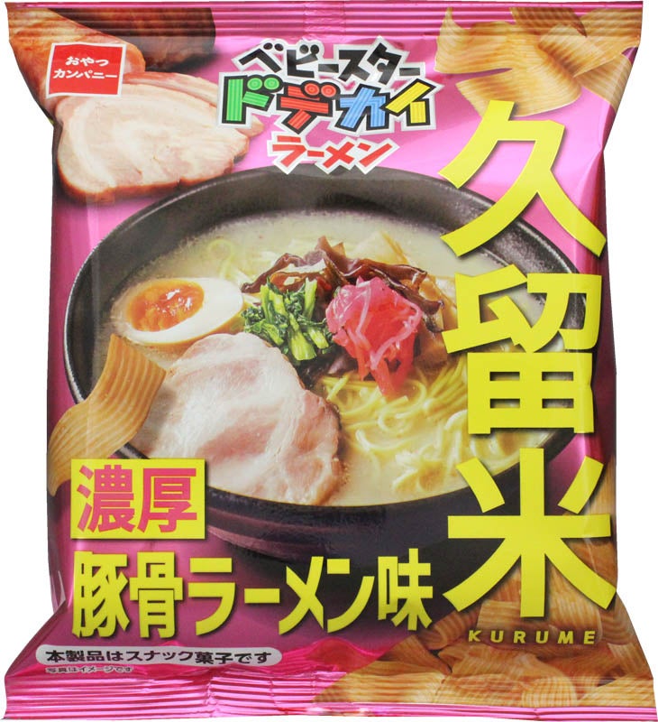 「ベビースタードデカイラーメン(久留米濃厚豚骨ラーメン味)」は、豚骨ラーメン発祥の地ともいわれている久留米市で長年愛されている、濃厚でコクのある白濁したスープが特徴のご当地ラーメンを表現。濃厚な豚骨スープの香りとコク深い旨みがクセになる味わいに仕上げています。