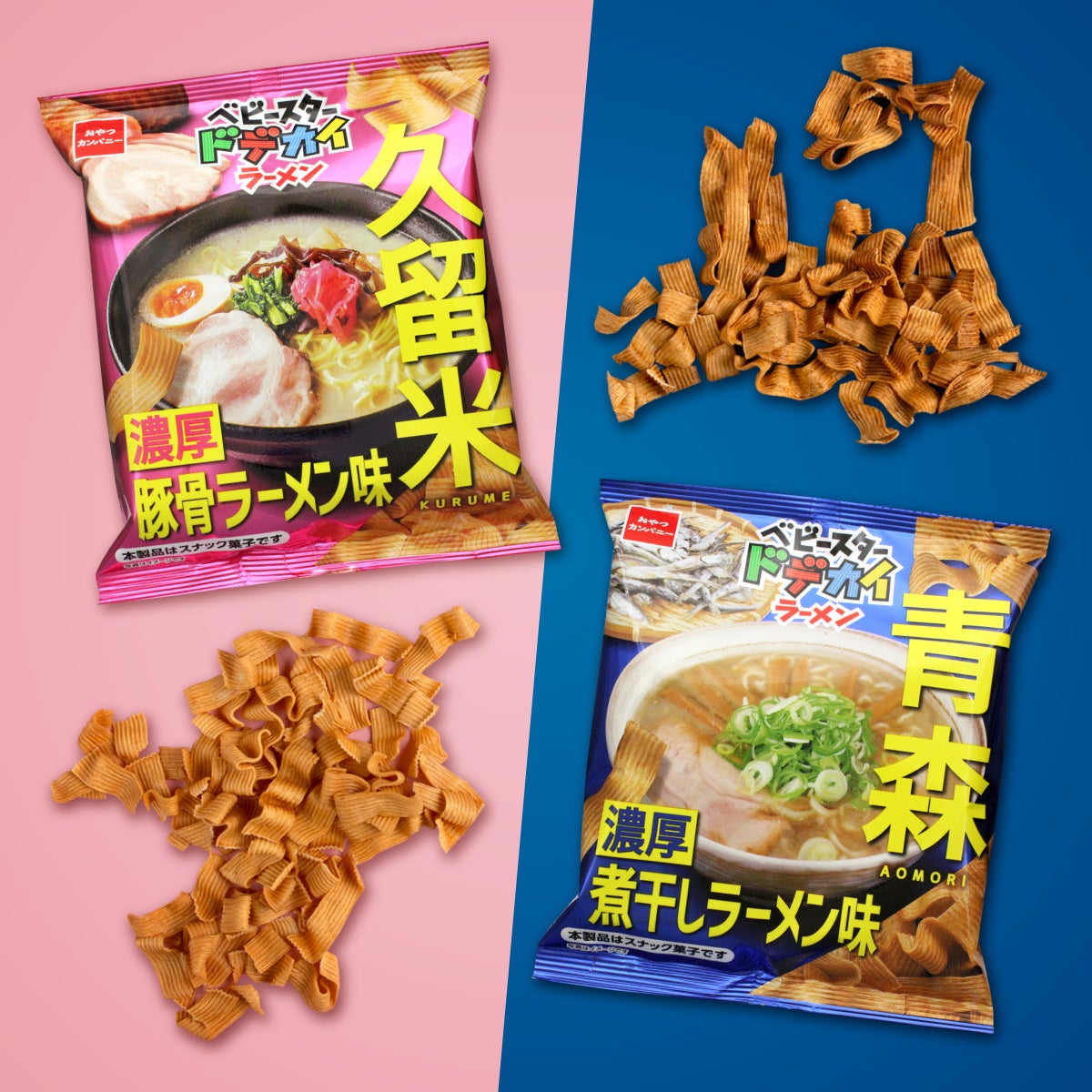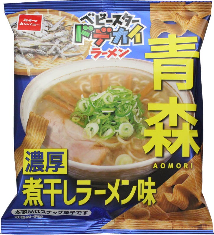 1959年に“ラーメンをそのまま食べる”という発想から生まれたベビースター。発売から60年以上も愛され続けている定番のチキン味に加えて、1988年よりカレー味・みそ味などの味のバリエーション化を図り、これまでに数えきれないほどの味をお届けしてきました。そんな小麦粉を練り上げ、麺から創るラーメンスナック菓子・ベビースターが、地元に愛されるご当地ラーメンを表現しました。「ベビースタードデカイラーメン(青森濃厚煮干しラーメン味)」は、煮干しを使ったダシに醤油ダレをあわせた濃厚で塩味がきいたスープが特徴の青森で愛されているご当地ラーメンを表現。ガツンと濃厚な煮干しの旨みに醤油のコクをきかせ、クセになる味わいに仕上げました。