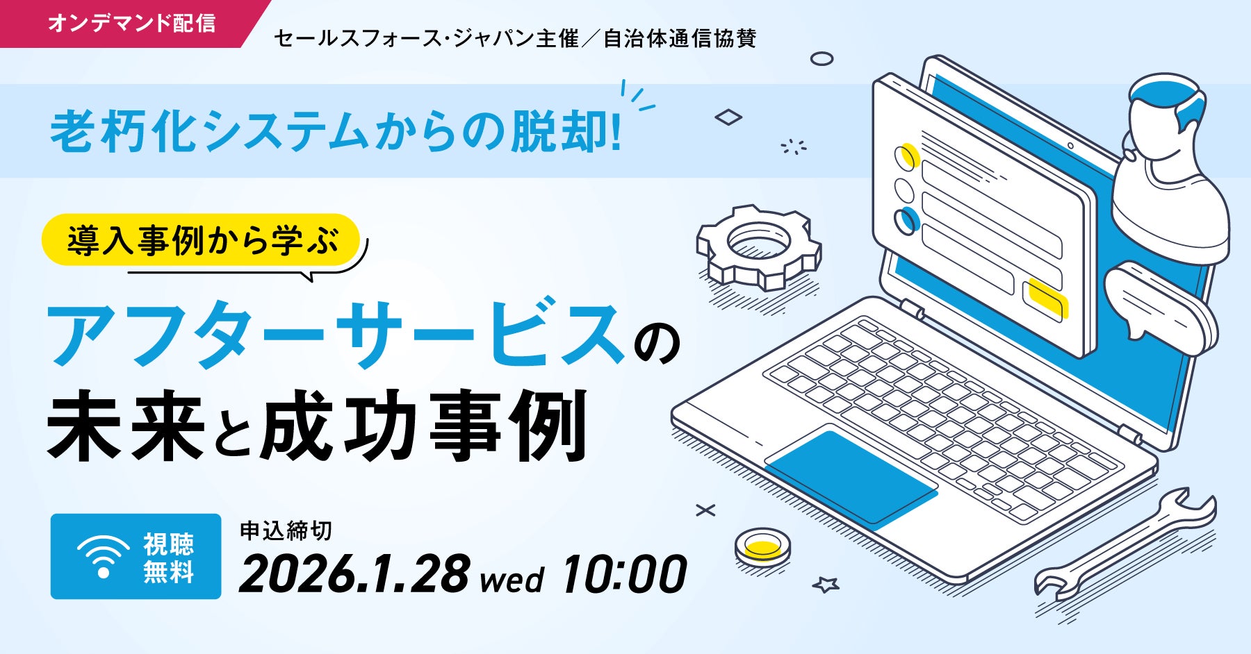 イシン株式会社(本社:東京都港区、代表取締役社長:西中 大史、証券コード:143A)が運営する公民共創の先進事例を紹介するメディア『自治体通信』は、株式会社セールスフォース・ジャパン主催セミナー「老朽化システムからの脱却!導入事例から学ぶアフターサービスの未来と成功事例」に協賛し、2026年1月31日(土)までオンデマンド配信を実施いたします。(申込期間:2026年1月28日(水)10時00分まで)