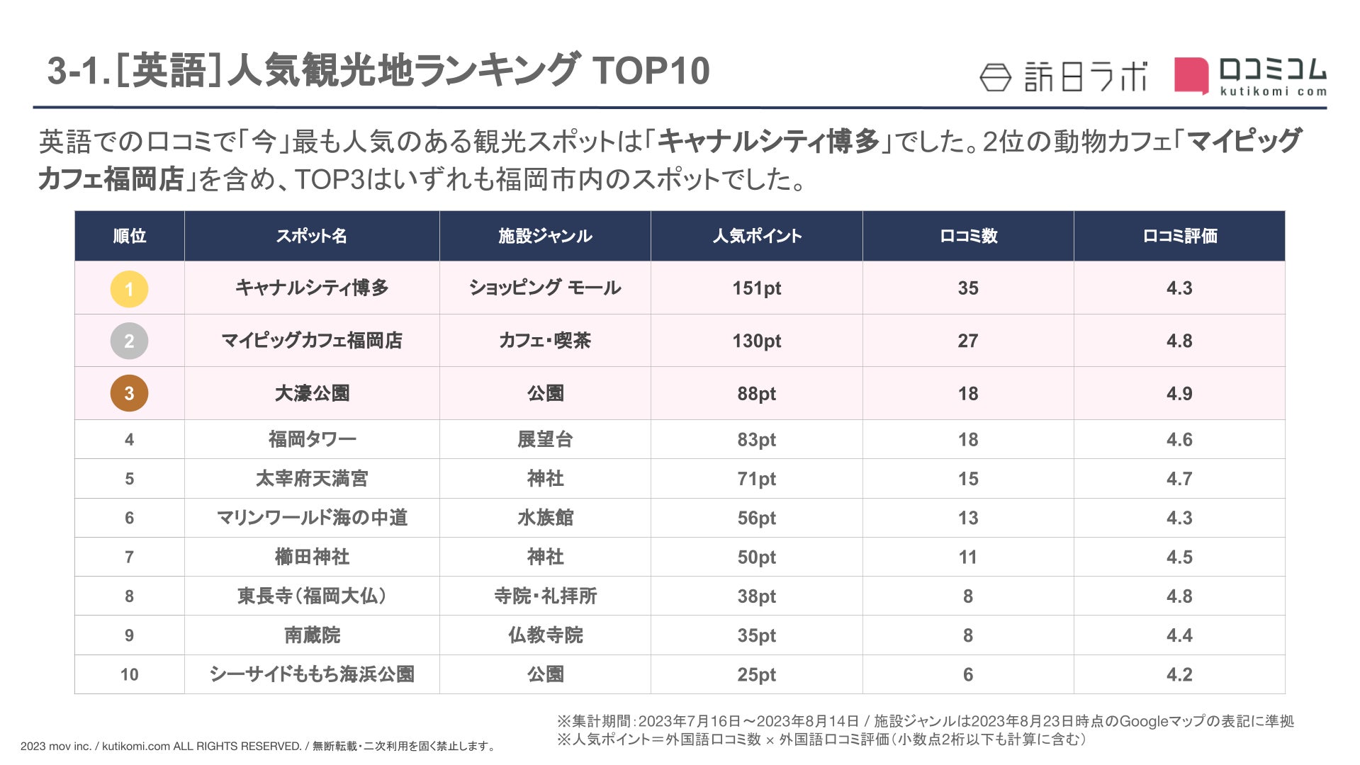 英語での口コミで「今」最も人気のある観光スポットは「キャナルシティ博多」でした。2位の動物カフェ「マイピッグカフェ福岡店」を含め、TOP3はいずれも福岡市内のスポットでした。