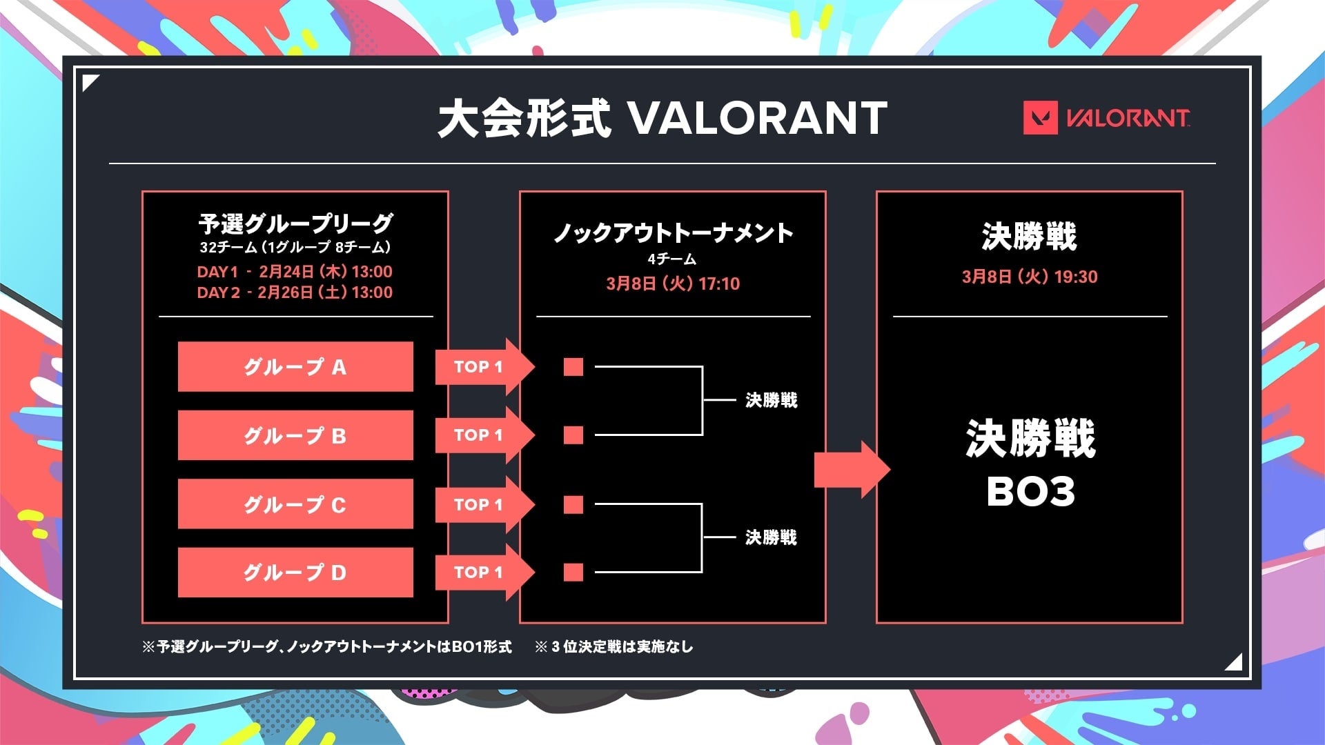 決勝トーナメントは、予選グループステージに進出した計4チームによる決勝トーナメントを行います。準決勝はBo1、決勝戦はBo3で行われます。