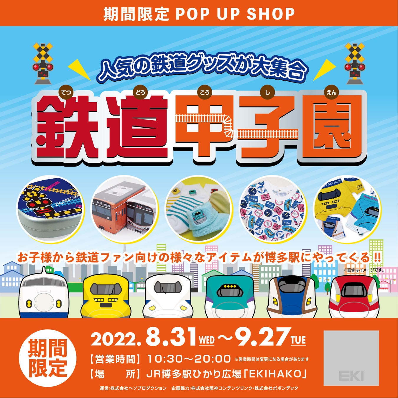 オリジナル商品の企画・制作・販売を軸に、企業・組織のトータルブランディングを手掛ける株式会社ヘソプロダクション(本社:大阪市福島区・代表取締役:稲本ミノル)は、2022年8月31日(水)から9月27日(火)までの間、人気の鉄道グッズが集まるポップアップショップ『鉄道甲子園』を、JR 博多駅 筑紫口2 階 ひかり広場「EKIHAKO」にて期間限定開催いたします。