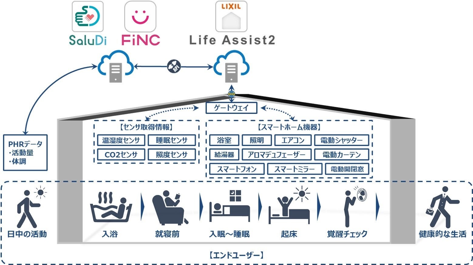 PHR事業者である当社の「FiNCアプリ」が有する歩数・運動・睡眠・生理情報および運動アドバイスと、同じくPHR事業者である沢井製薬株式会社の「SaluDiアプリ」が有する服薬情報および体調のデータを、サービス事業者である株式会社LIXILが開発したスマートホームシステム「Life Assist2(ライフアシスト2)」と連携し、自宅内外の活動量や体調等を把握、入浴~入眠~睡眠中~起床時という一連の流れの中で適切なタイミングで住宅機器のコントロールや行動リコメンドを実施します。これにより、個人に合わせた快適な睡眠を誘導し、健康で心地よい毎日を送れるようになることを目指します。