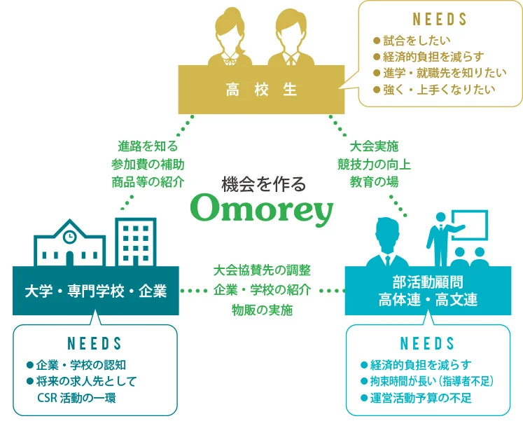 株式会社おもれいは、部活動生を対象としたイベント「部活フェス」や、高等学校体育連盟・高等学校文化連盟・各協会へ協賛の実施、高校内の進学説明会をおこなっています。