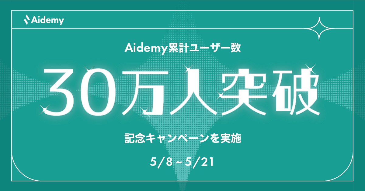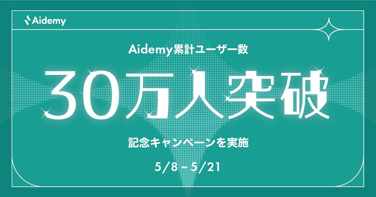 この度、Aidemyの累計ユーザー数30万人突破の感謝をユーザーの皆さまに伝えるとともに、社内人材を活用したAI/DX推進を目指す法人のお客様、ならびにAIプログラミングスキルを習得しキャリアアップを目指す個人のお客様へ、さらなる学習支援と機会の提供拡大をすべく、5/8~5/21にかけて記念キャンペーンを実施いたします。
