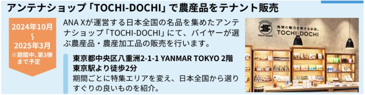 ANA Xは、今後も全国の地方自治体様・企業様と連携し、「TOCHI-DOCHI 東京駅八重洲口店」をはじめとした各種事業・サービスを通じて、地域の魅力を発信してまいります。どうぞご期待ください。