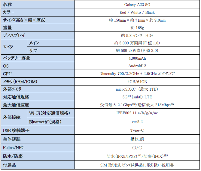 「Galaxy A23 5G」の特長は、以下のとおりです。