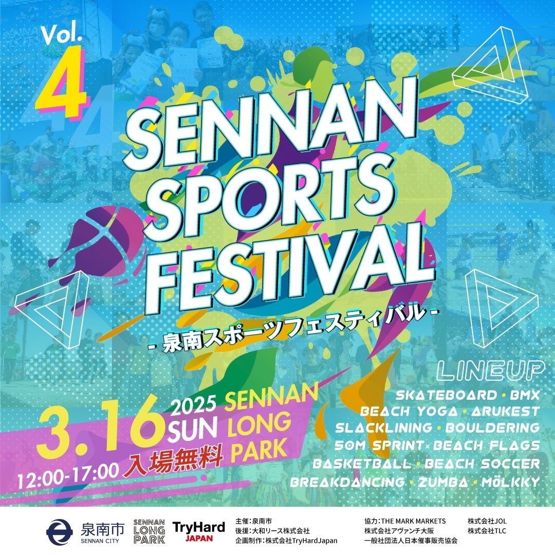 泉南市と株式会社TryHard Japan(大阪市中央区)は、2025年3月16日(日)、SENNAN LONG PARK(泉南りんくう公園)(大阪府泉南市)にて、複合型スポーツイベント「泉南スポーツフェスティバルvol.4」を開催いたします。