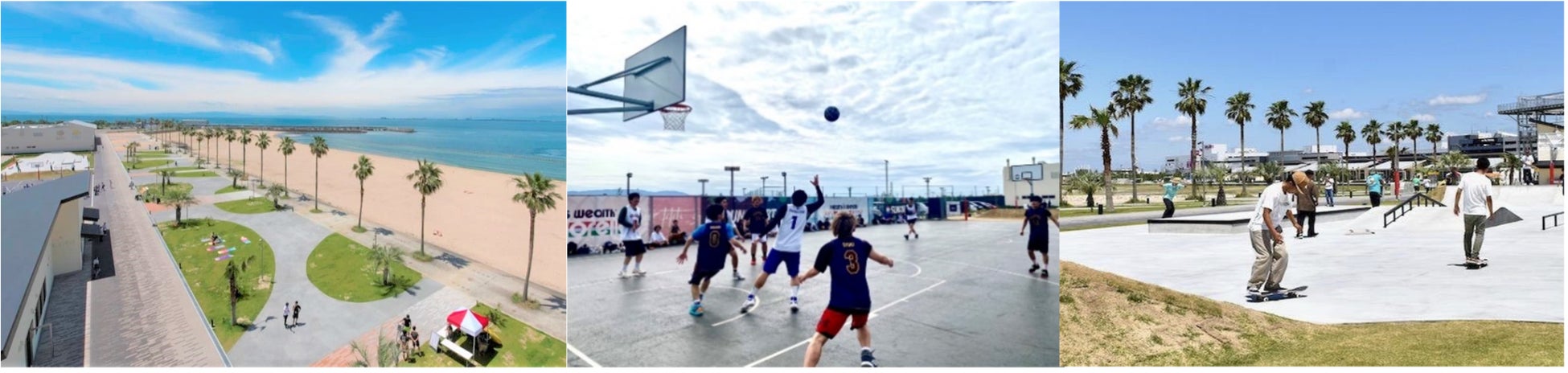 関西の玄関口である関西国際空港の対岸に位置する、関西最大級の交流・レクリエーションスポットです。高さ15.5mの高所アスレチックをはじめ、スケボーパーク・サッカーグラウンドなどのスポーツ施設を備えた『アクティビティエリア』や、ビーチをイメージしたBBQ場、テラス席の飲食店が並ぶ 『コミュニティエリア』、岡田浦漁港とのタイアップにより、泉州の自然の恵みをたくさん受けた、地元ならではの食材が楽しめる『マルシェエリア』、キーカラーが象徴的なヴィラが並び、キッチン、リビング、ジャグジー、BBQダイニングが用意されたお部屋でプライベートな時間を楽しめる『グランピングエリア』の4つのエリアに分かれており、一日を通してスポーツ・食・レジャーを丸ごとお楽しみいただけます。