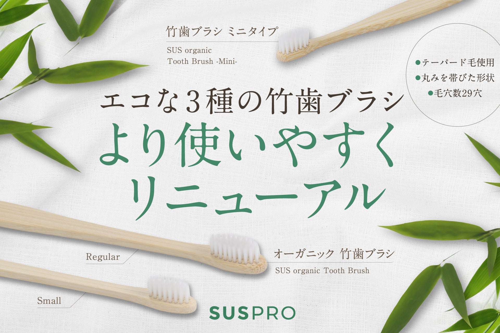 オリジナルグッズを制作するアイグッズ株式会社(本社:東京都渋谷区)は、ホテル・旅館向けエコアメニティを展開する『SUS amenity(サスアメニティ)』ブランドより、竹を使用した『SUS organic Tooth Brush(オーガニック 竹歯ブラシ Regular/Small)』『SUS organic Tooth Brush -Mini-(竹歯ブラシ ミニタイプ)』を、2025年10月下旬より順次リニューアル発売します。