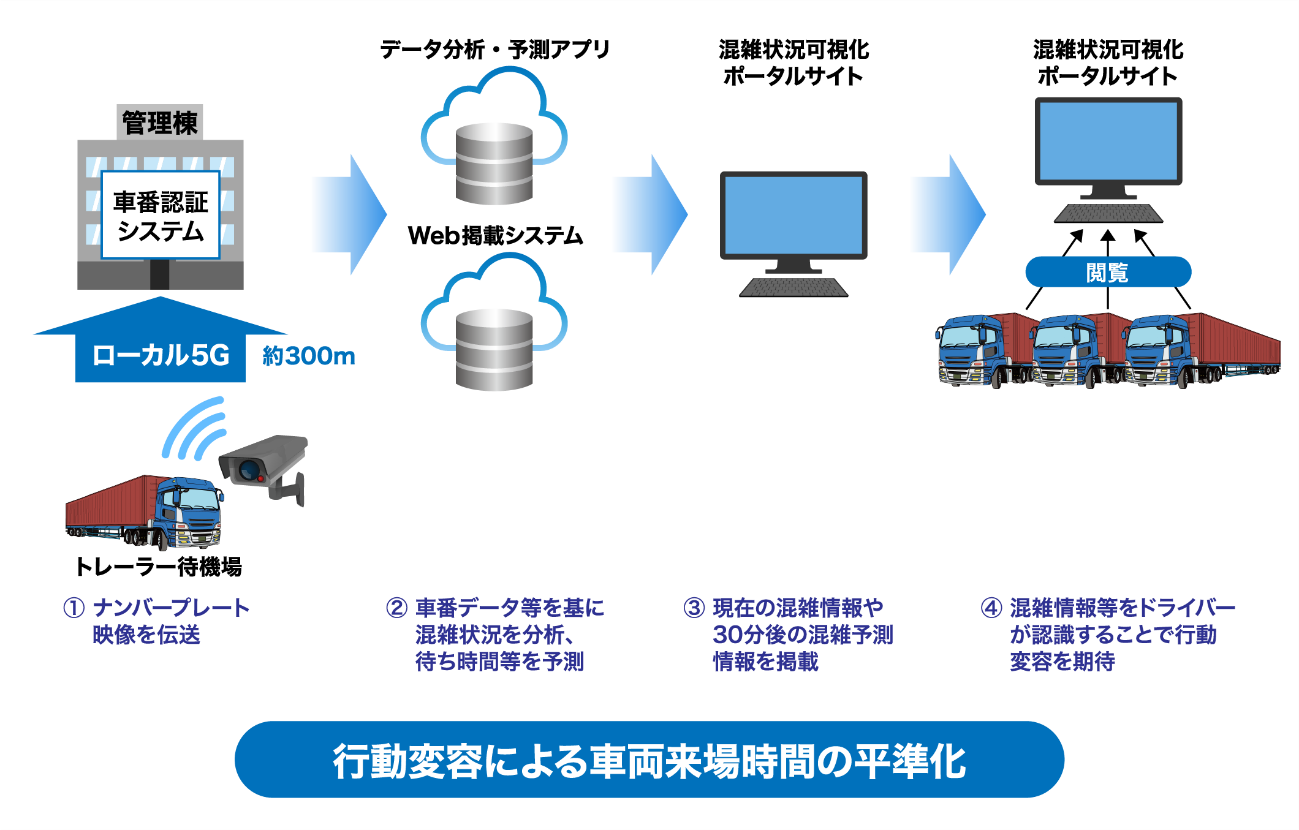 トレーラー待機場からローカル5Gにより車番認証システムへ送られてきたトレーラーのナンバープレート画像を基にデータ分析と混雑状況の予測を行い、待ち時間の予測情報をポータルサイトに掲載することで、ドライバーの行動変容を促し、車両来場時間の平準化が実現できるかを検証します。