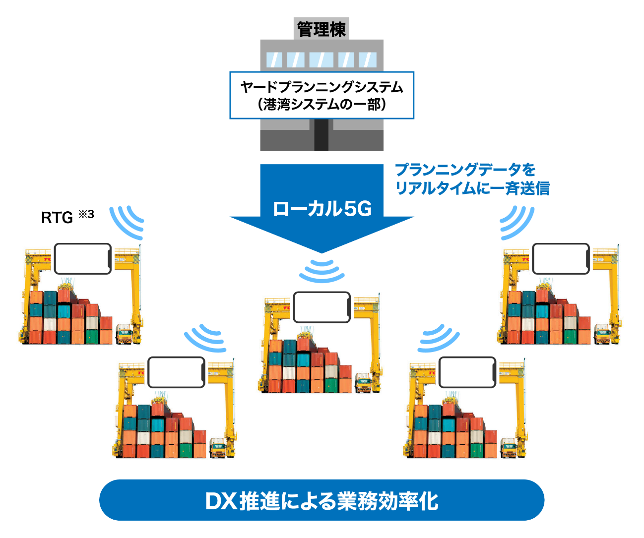 このような課題に対応するため、夢洲コンテナターミナル内にローカル5G環境を構築し、コンテナターミナル内業務ネットワークの高品質化、コンテナプランニングデータ※2のリアルタイム伝送による保管工程業務の効率化、トレーラー待機場の混雑状況の可視化を実現し、実環境下での港湾・コンテナターミナルのDX化による効果を実証します。