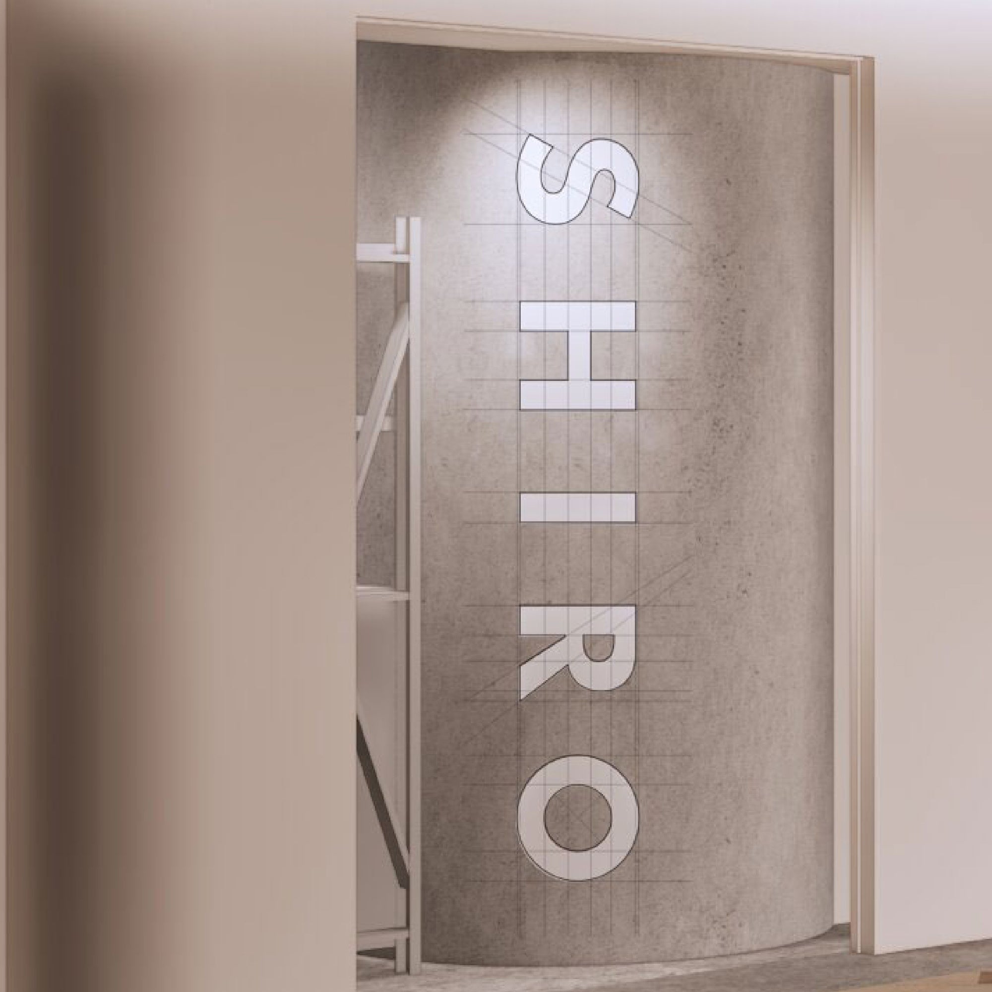 香港の日常に根付いたこれら2つの資材に魅了され、お店づくりには数回足場に使われ、その役目を終えると廃棄されてしまう竹を再生させたいと思いました。幾度か使用された竹は、歴史を刻んだからか色の変化や傷さえも美しく見えます。それらを什器の側面に縦に並べた様子は香港の歴史を物語り、ブリキはレジカウンターやストックドアへ使用しました。さらにSHIROはブランドのすべてを開いているように、パブリック通路に面したストックは今回開くことにしました。また、通路にあるブランドロゴはレタリングのベース ラインをあえて残し、手書きでペイントします。