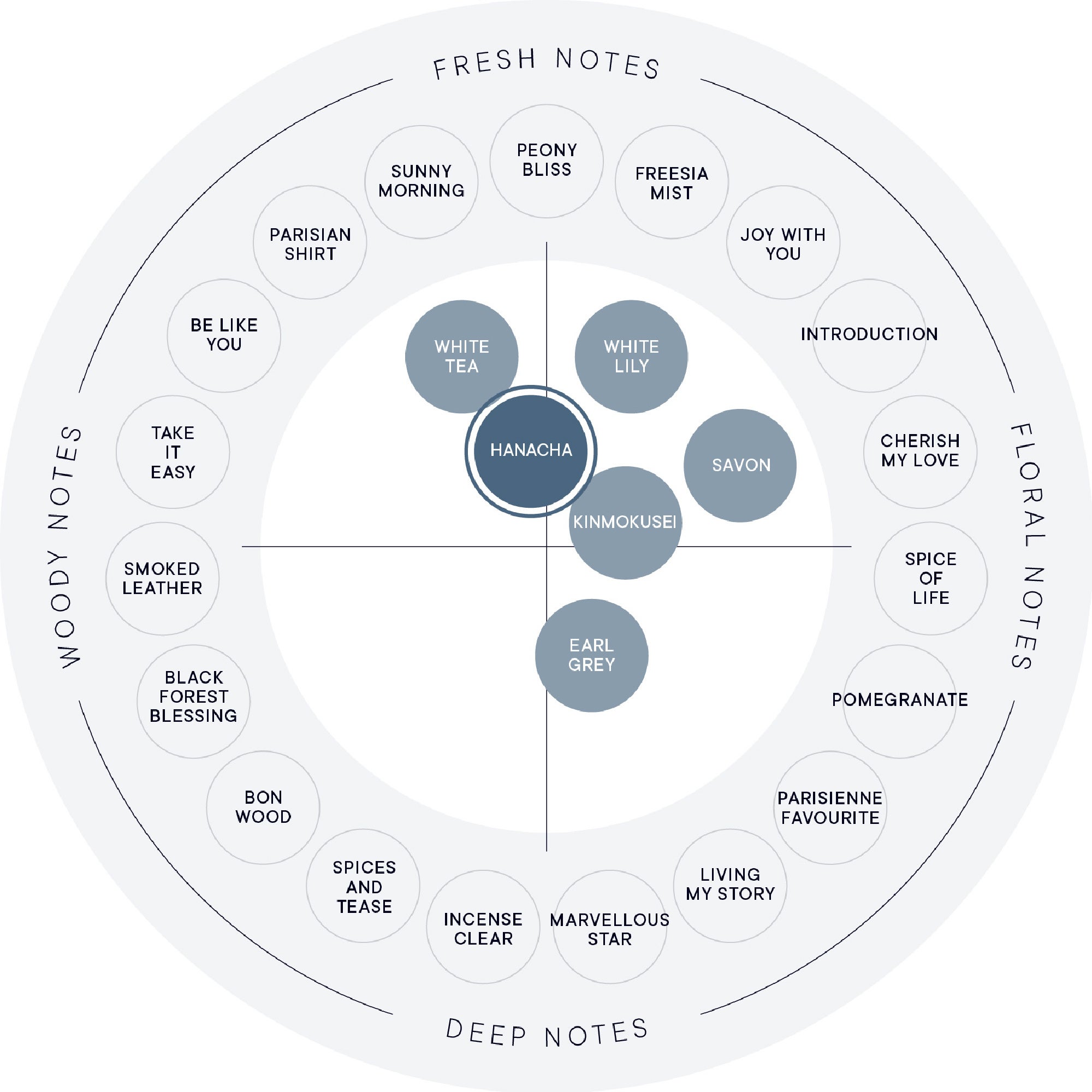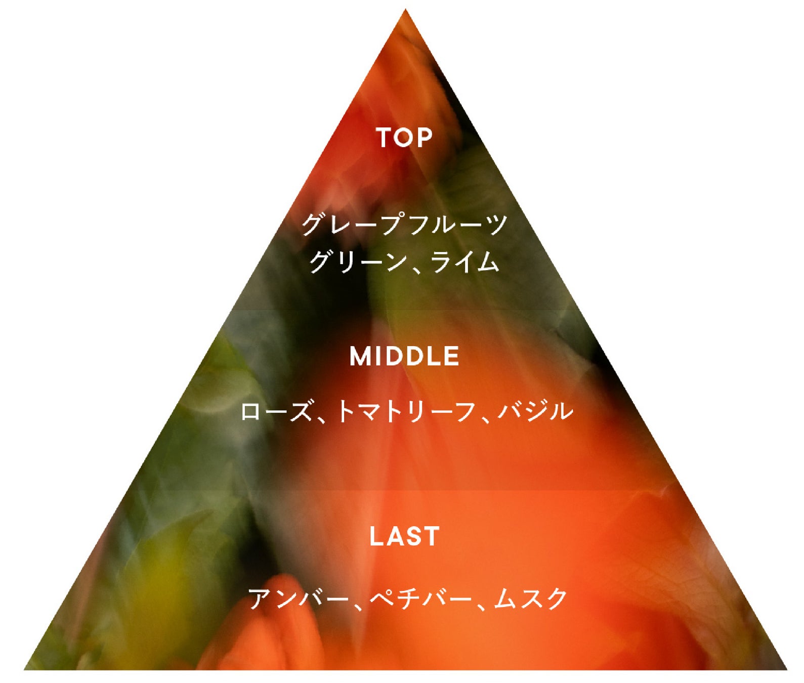 このように香港の茶文化からイメージした“花茶”のトップには、みずみずしい柑橘が爽やかに広がり、ミドルにはバジルなどのハーバルグリーンとナチュラルなローズが溶け合い、ラストはムスクのやさしい温もりが全体を包み込みます。高温多湿な香港の気候になじむ、リフレッシュ感に満ちた爽やかな香りです。