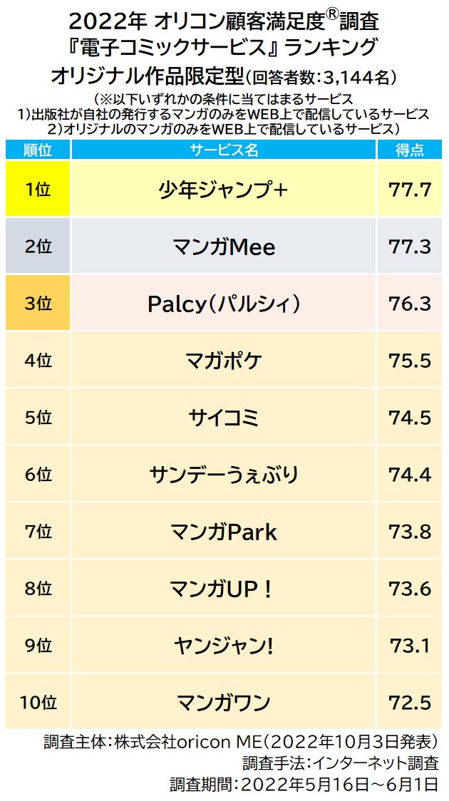 総合1位は週刊少年ジャンプの作品も充実している【少年ジャンプ+(株式会社集英社 本社:東京都千代田区)】、総合2位は少女マンガに強みを持つ【マンガMee(株式会社集英社 本社:東京都千代田区)】、総合3位は講談社とpixivの共同プロジェクト【Palcy(株式会社講談社 本社:東京都文京区)】という結果となりました。