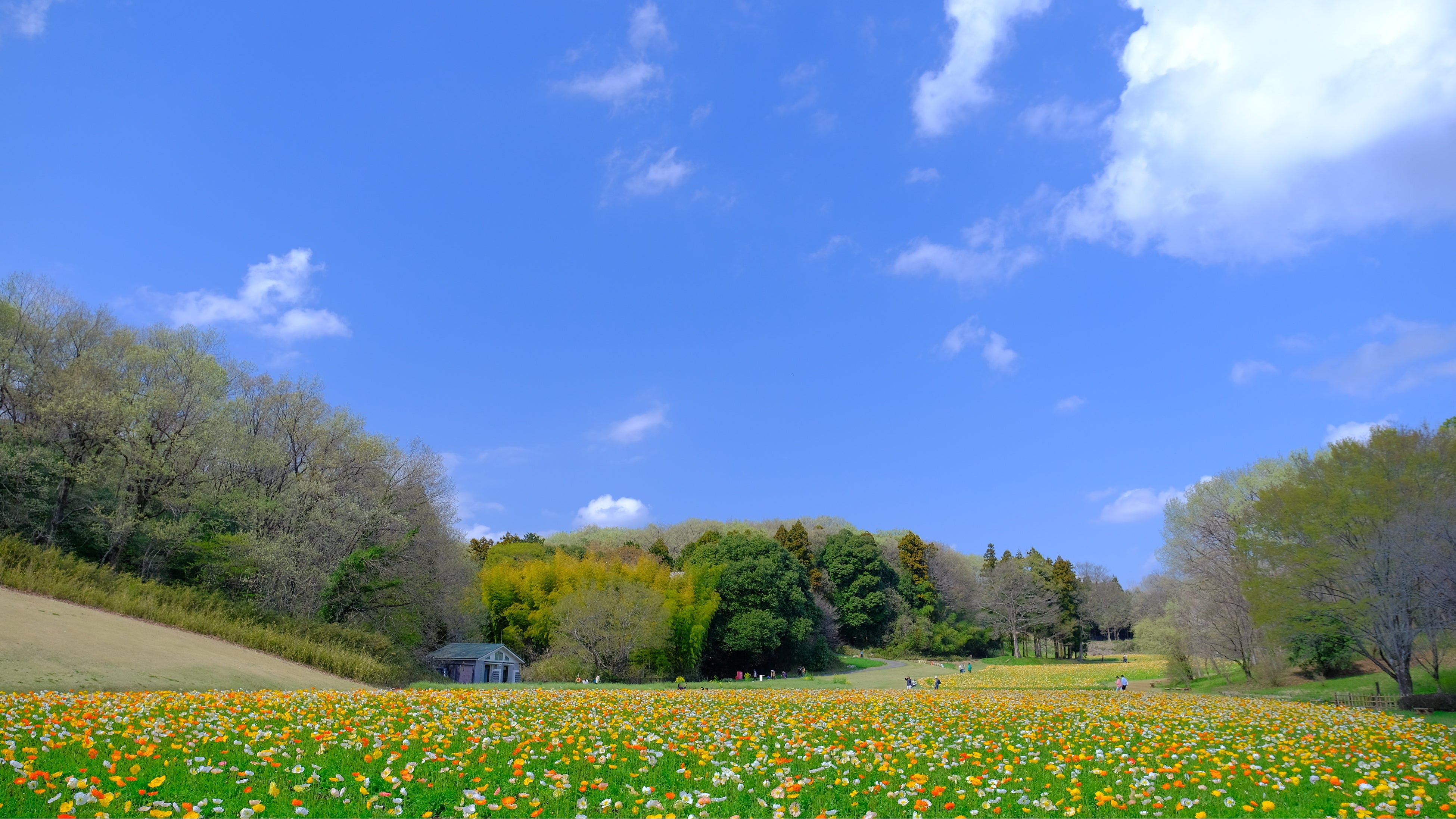 シベリアなどが原産の、寒さに強い「アイスランドポピー」。里山の柔らかな新緑を背景に、明るい黄色、白、オレンジの花畑が公園に春を告げます。明るいビタミンカラーで透け感のある柔らかな花びらが風に揺れ、奥行きのある花畑の景観が非常に写真映えしますので、ぜひ撮影もお楽しみください。