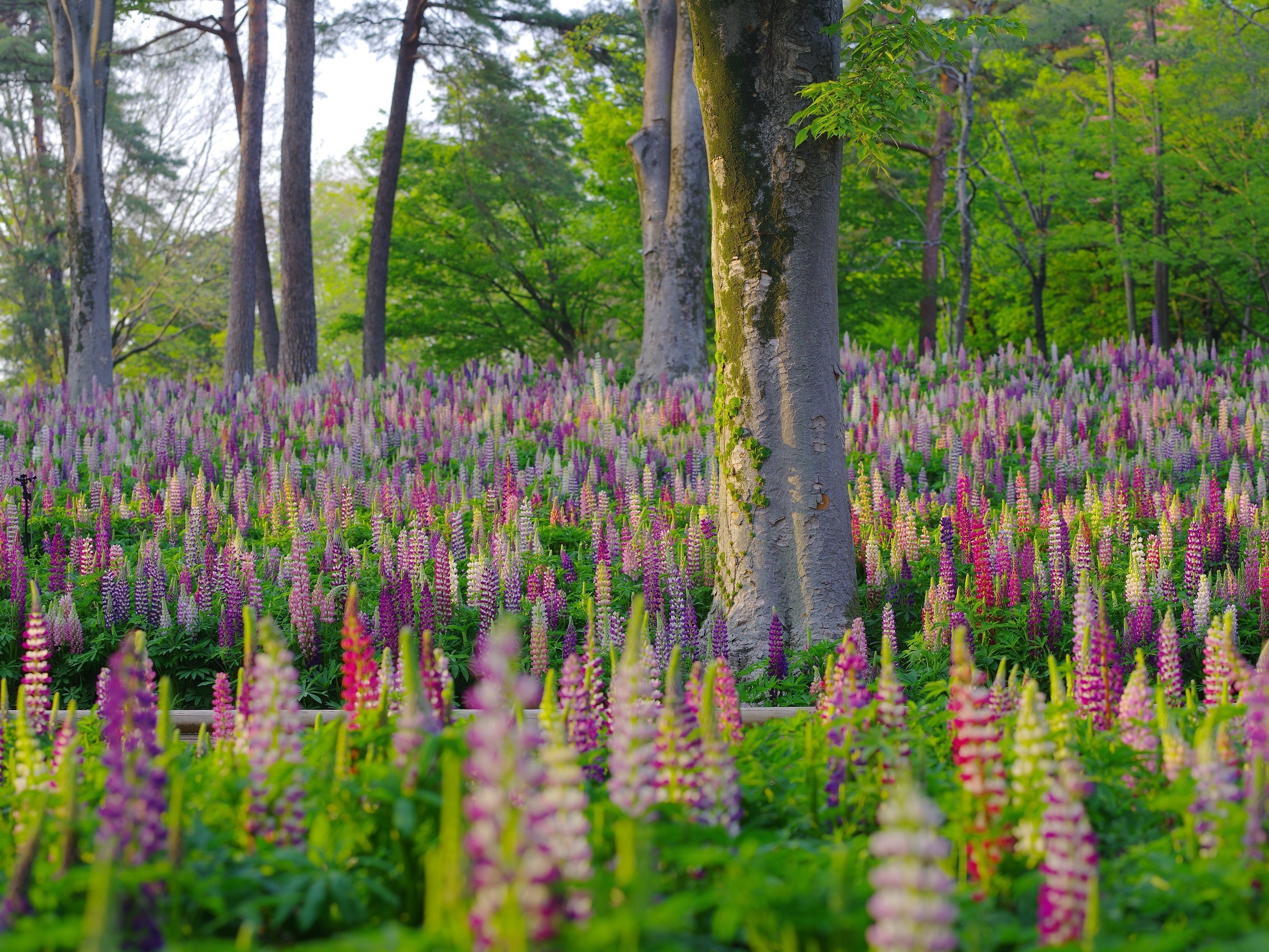 フジに似た花が下から咲きあがる姿から「ノボリフジ(昇り藤)」の別名もついており、紫・ピンク・白など色が豊富なだけでなく濃淡もある美しい花です。空に向かって咲くルピナスに、ケヤキの木漏れ日が射し、幻想的な景色をお楽しみいただけます。
