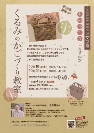 一社SAVE IWATE 理事長 寺井良夫氏をお招きし、岩手県産のくるみの木皮を使用したくるみかご教室を同時開催します。