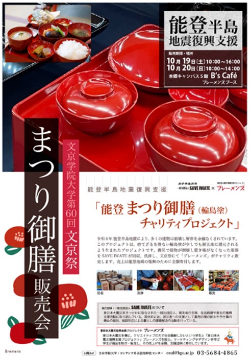 文京学院大学×SAVE IWATE緊急コラボ企画 手放された輪島漆器を大学祭でチャリティ販売 学生が能登まつり御膳(輪島塗)チャリティプロジェクトで能登を応援!