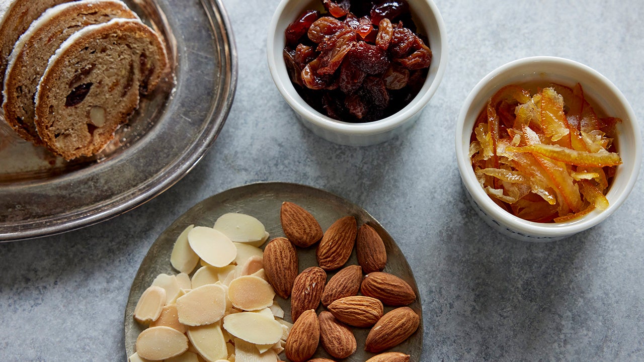 さらにドライフルーツと、ホールとスライスで食感に違いを出したアーモンドをたっぷりと混ぜ込みます。今年はアーモンドの量を増やし、具材感と香ばしさをより一層高めました。