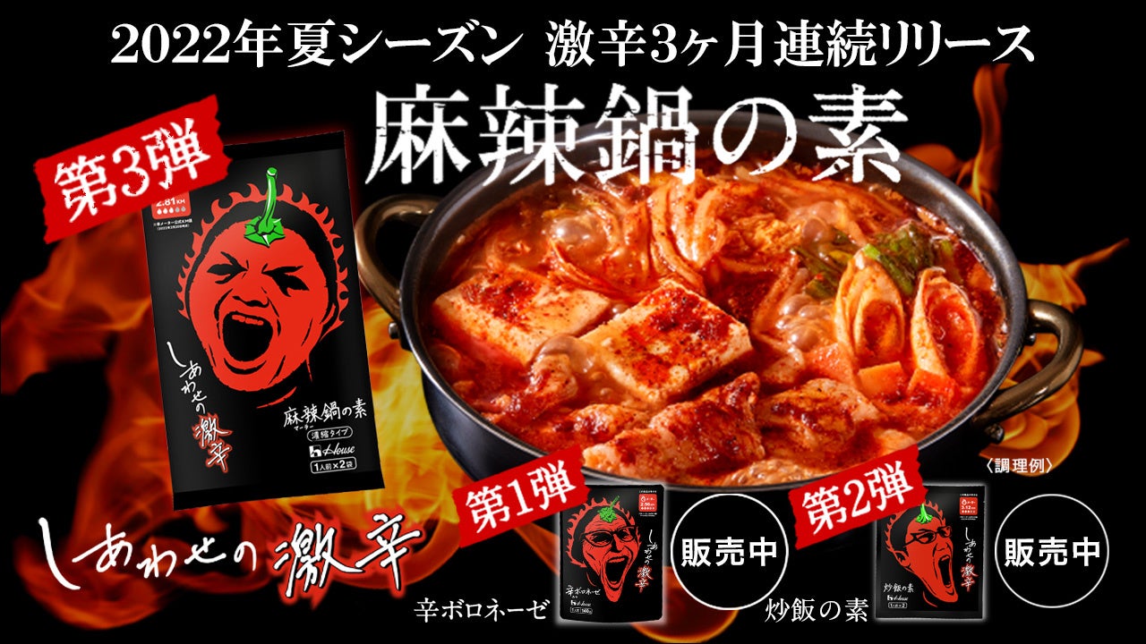 ハウス食品は、今年の夏を“激辛”で盛り上げるため、「しあわせの激辛」シリーズの新製品を6月、7月、8月の3ヶ月連続で発売いたします。第1弾(6/27発売)の<辛ボロネーゼ>、第2弾(7/25発売)の<炒飯の素>に続き、第3弾となる「しあわせの激辛」<麻辣鍋の素>を、8月29日よりECサイトを中心に発売します。4種の唐辛子の染み渡る辛さと、豆味噌の旨みと花椒のビリビリするしびれが特徴の“激辛麻辣鍋”が作れる本品は、同シリーズの<チキンカレー><麻婆豆腐><辛ボナーラ><ラーメン><辛ボロネーゼ><炒飯の素>に続く、シリーズ7つ目のアイテムとなります。