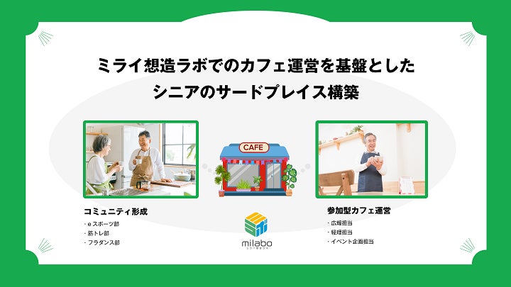 | 採択プロジェクト名: 「シニアの新たな憩いの場に。サードプレイスカフェプロジェクト」 概要:COOONが有する障がい者が活躍するコーヒースタンドの運営ノウハウを活かし、ツクイホールディングスが運営するシニア向けサービス研究所「ミライ想造ラボ」において、シニアとともに運営するコミュニティカフェの実証を行う。これにより、カフェを起点として娯楽や学習など様々なコンテンツを提供するシニアコミュニティを形成し、将来的にはオンラインも含めた、第三の居場所「サードプレイス」の実現を目指す。 |