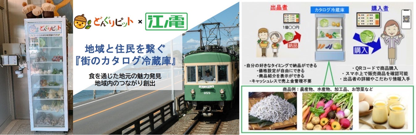 | 採択プロジェクト名: 「地域と住民を繋ぐ『街のカタログ冷蔵庫』」 概要:どんぐりピットが開発した、地域の食品が気軽に出品・購入できる「カタログ冷蔵庫」を江ノ電江ノ島駅などの施設に設置し、地元住民やリピーター観光客に向けて、地元の農水産物や飲食店の商品を販売する実証を行う。これにより、食を通じた地元の魅力発見や地域内のつながりを生み出し、DXを通じた湘南・鎌倉エリアの更なる賑わいと回遊の創出を目指す。 |