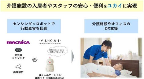 | 採択プロジェクト名: 「コロナ禍と共存する介護施設の入居者やスタッフの安心・便利を支えるBOCCO emo×マクニカセンサー」 概要:ユカイ工学の使い手に優しいインターフェースを搭載したロボットと、マクニカが有する空気質や画像の先端センシング技術を連携させ、介護施設において入居者やスタッフに施設内の状況を通知し、業務環境を改善する実証を行う。これにより、コミュニケーションロボットによる入居者やスタッフの安全・安心を提供するサービスの創出を目指す。 |