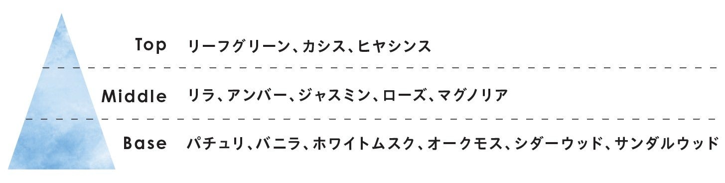 さわやかでクリーンなムスクが優しく包み込み、明るくて心地よい印象に。洗いたてのリネンような清潔感のある香り。