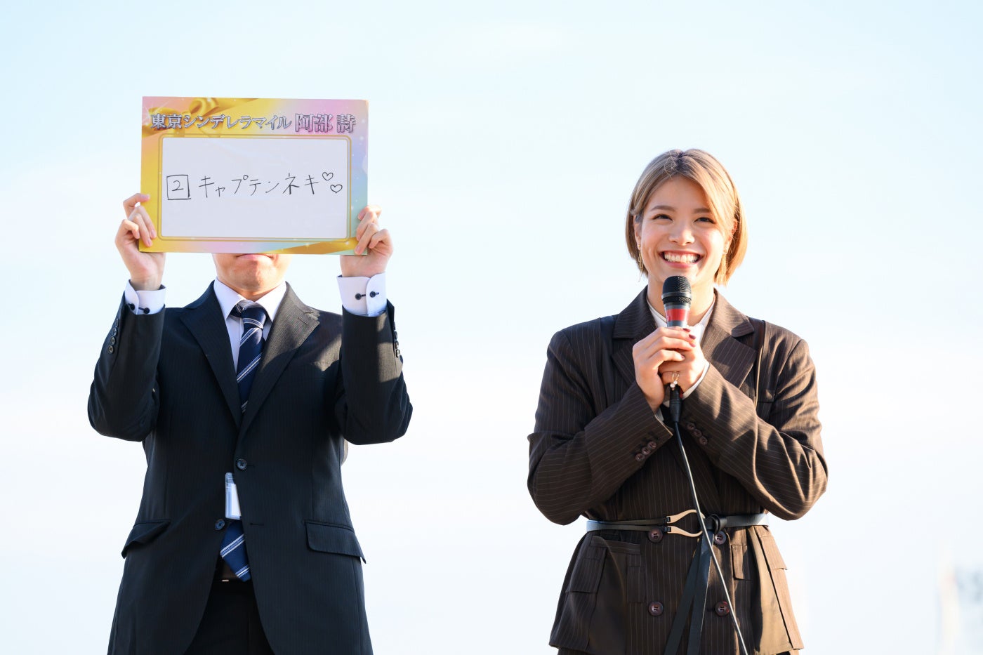 キャプテンネキは惜しくも9着となり的中とはなりませんでしたが、表彰式のプレゼンターを務めた後、阿部さんは勝利ジョッキーの矢野貴之騎手とファンに向けにこやかに手を振り、レース後の興奮冷めやらぬ場内の声援に応えていました。