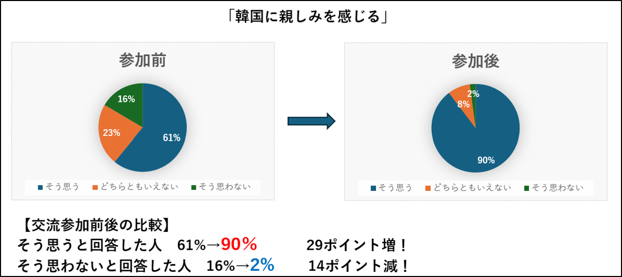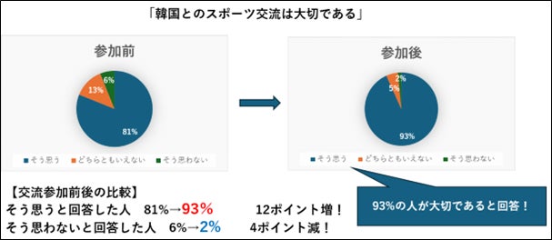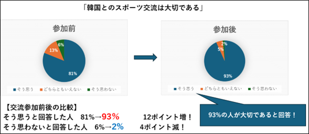 交流を通じて、「韓国に親しみを感じる」ことや「韓国とのスポーツ交流は大切である」という設問に同意する回答が増加していることや、「再び交流に参加したい」という設問に同意する回答が9割を超えることなどが確認できました。