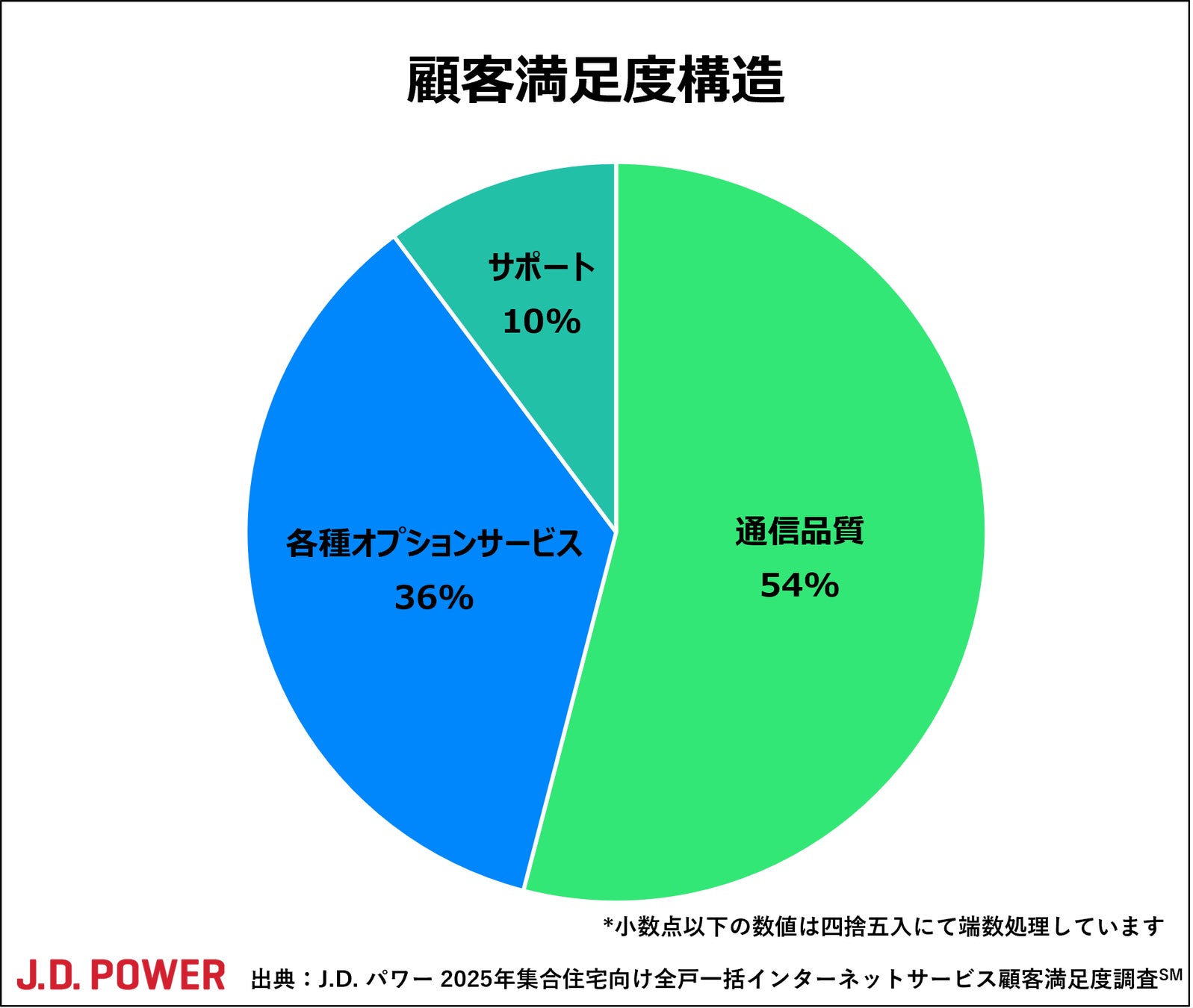満足度の測定にあたっては「通信品質」、「各種オプションサービス」、「サポート」の3ファクターを設定し、各ファクターの総合満足度に対する影響度を基に、総合満足度スコアを算出した。集合住宅向け全戸一括インターネットサービスの総合満足度に対する影響度は、「通信品質」が54%と最も大きく過半を占めた。