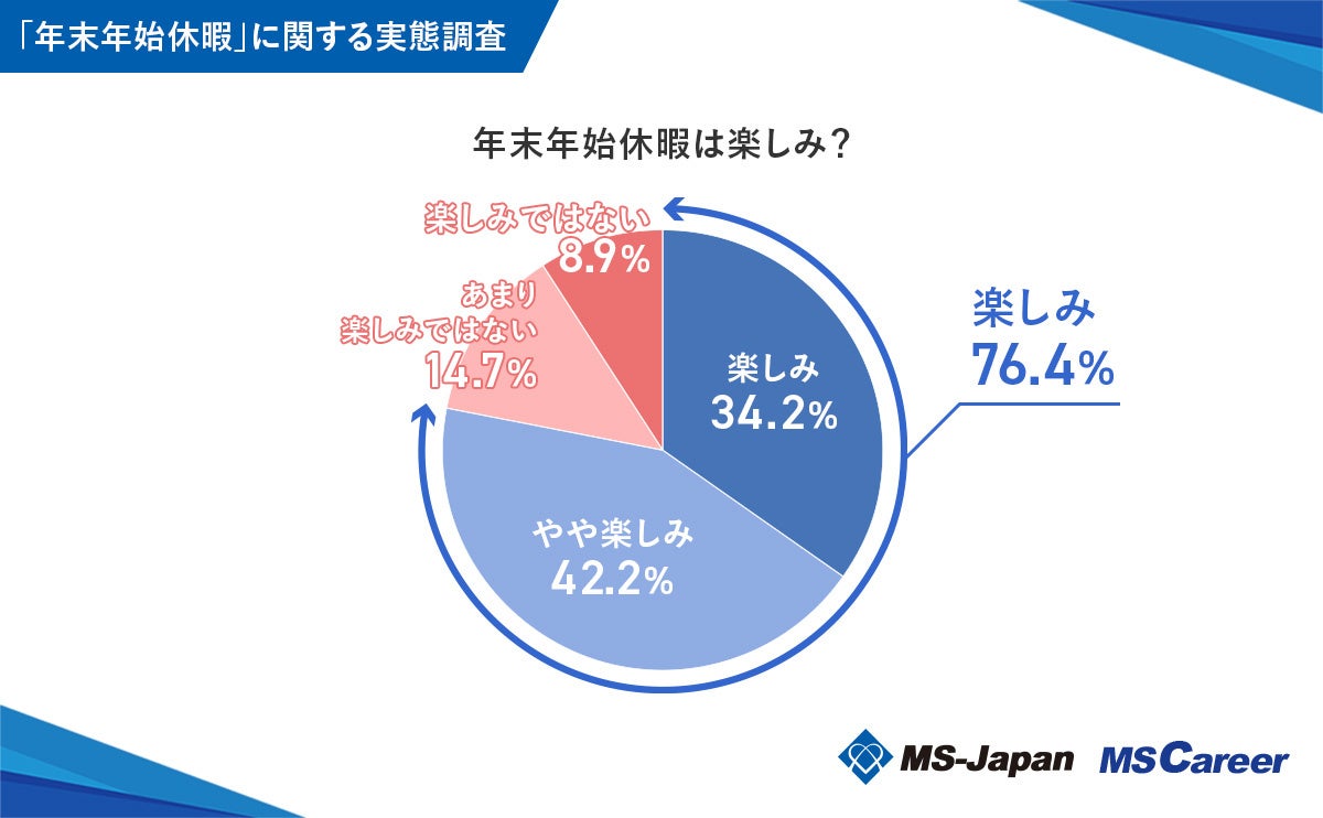 続いて、年末年始休暇は楽しみか否かについても調査を実施。76.4%が「楽しみ」と回答した一方、23.6%は「楽しみではない」と回答する結果に。