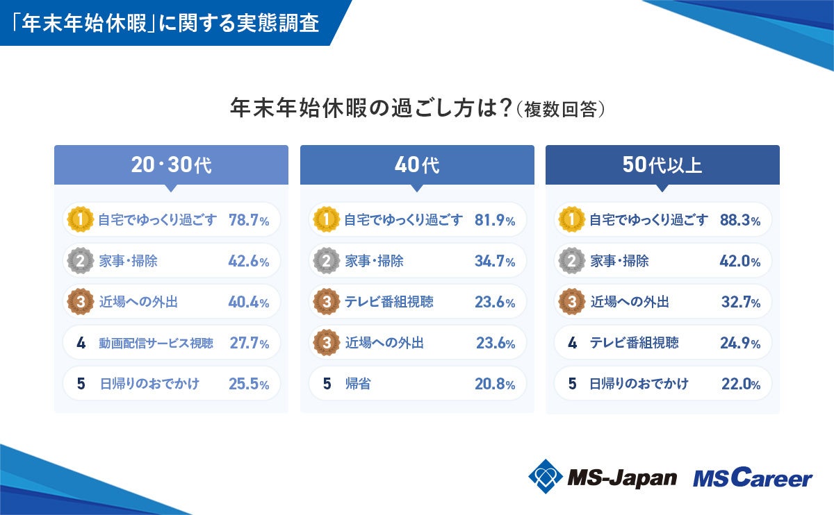 年代別では、どの年代でも1位「自宅でゆっくり過ごす」、2位「家事・掃除」が選ばれる結果に。