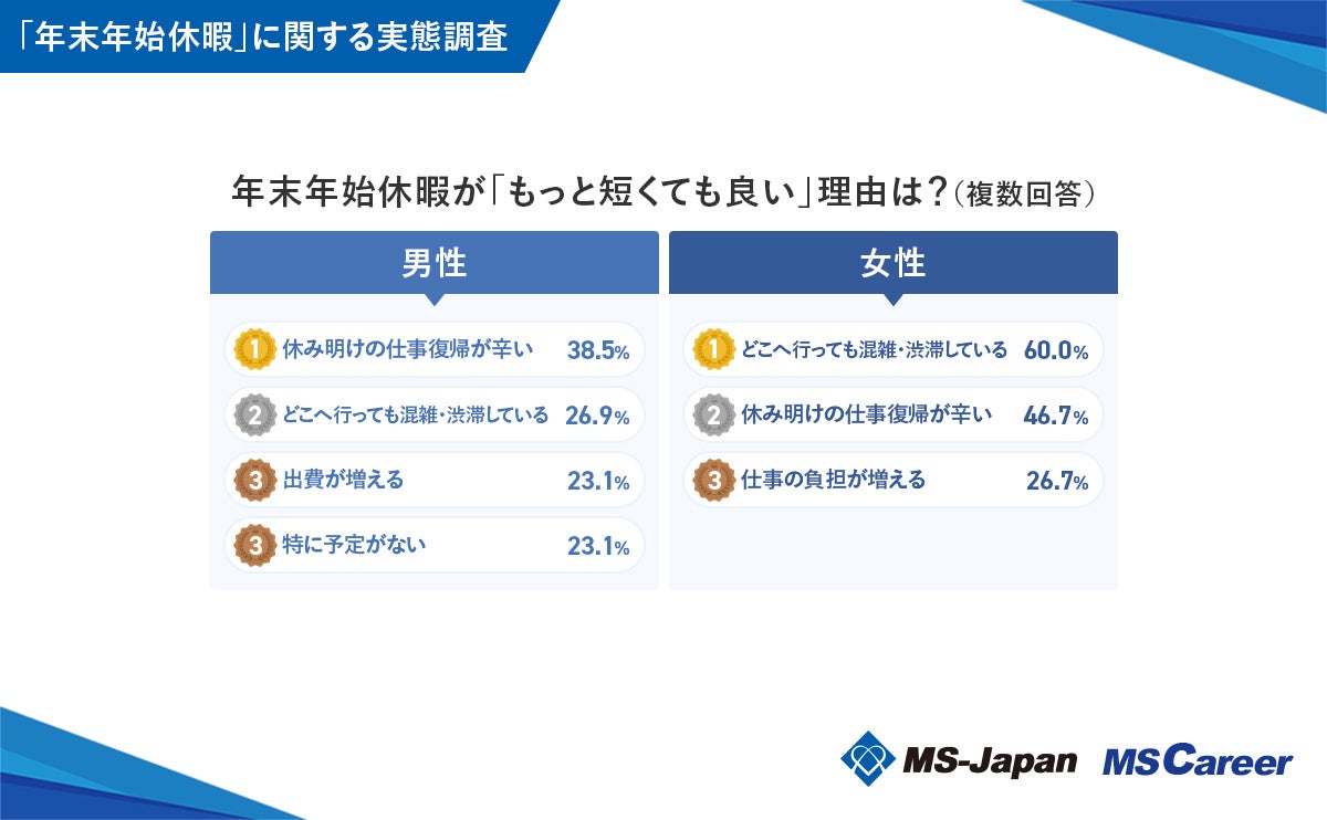 ・年末年始休暇が「短くて良い」理由、第1位は「休み明けの仕事復帰が辛い(40.0%)」
