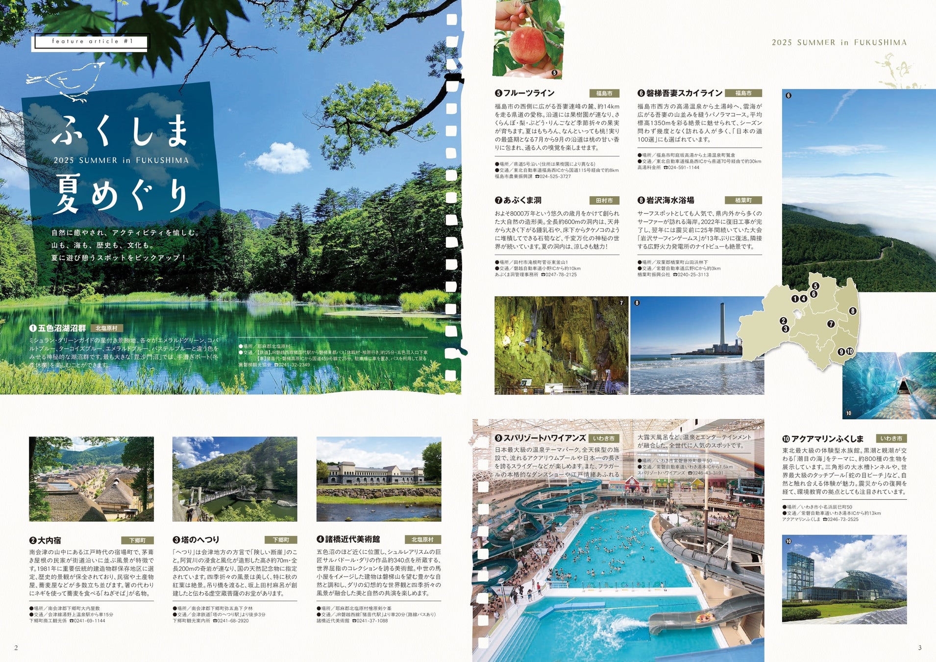 巻頭では、「ふくしま夏めぐり」と題し、福島県内の自然や文化・グルメが楽しめる夏のおすすめ観光スポットをご紹介しています。五色沼や磐梯吾妻スカイラインなど、夏休みの旅行や帰省の際に訪れたくなる魅力的な名所が満載です。また、福島の夏を代表する果実「桃」に焦点を当てた「もも学」では、桃の品種ごとの特徴や収穫時期、美味しい食べ方のポイントなど桃にまつわる奥深い知識を楽しく学べる内容となっています。読めば「桃」を味わいたくなる特集です。